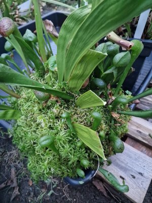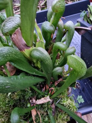 | La plante pousse avec un hybride de sarracenia. Elle est cultivée en fond de jardin, à l'ombre des sarracenia. Elle est cultivée avec les sarracenia, donc toujours avec de l'eau au pied. Le substrat est 70 tourbe et 30 % perlite. Elle pousse ici depuis des années. C'est le meilleur résultat. Les autres poussent moins ou végètent dans d'autres endroits du jardin, souvent plus à l'ombre. J'ai mis une grosse couche de surfaçage de sphaigne vivante. Suite aux tests de David Deymel, je vais mettre un plant en suspension dans mon bac à Aldrovanda, avec les psittacina. |